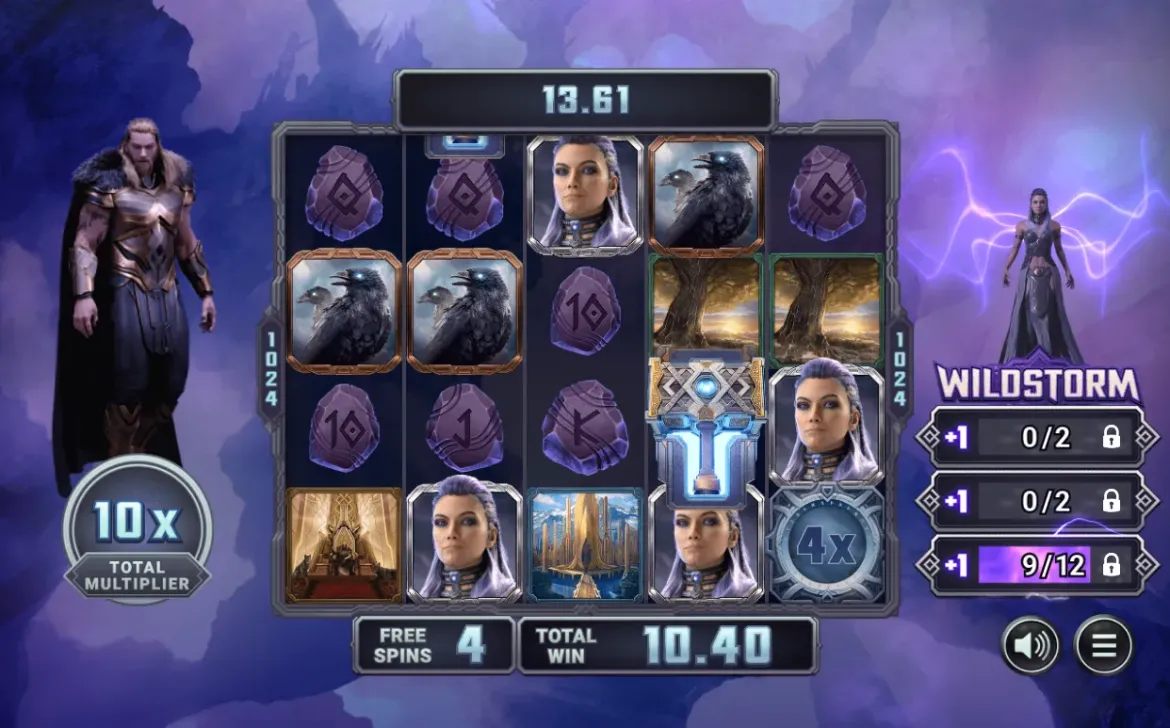 Landing three or more scatter symbols (Thor’s hammer) anywhere on the reels triggers the Free Spins bonus round. You’ll spin a bonus wheel to determine the number of free spins (up to 25) and the starting multiplier (up to x12). During free spins, you can collect Wildstorm tokens for extra wild reels and additional free spins, making this round especially lucrative.